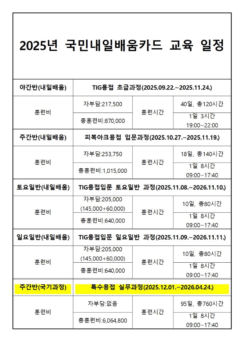 국민내일배움카드 교육생 모집 페이지 정보 작성자 관리자 댓글 0건 조회 944회 작성일 25-08-11 13:59 본문 국민내일배움카드 교육생을 모집합니다.주간반, 야간반, 주말반 등 기초부터아주 세심하게 기술지도를 하오니초보님들 망설이지 마시고 지원해 보세요~~~^^ 목록 다음글국민내일배움카드 교육생 2차 모집(야간반, 토요일반, 일요일반) 25.01.23 댓글목록 댓글목록 등록된 댓글이 없습니다.